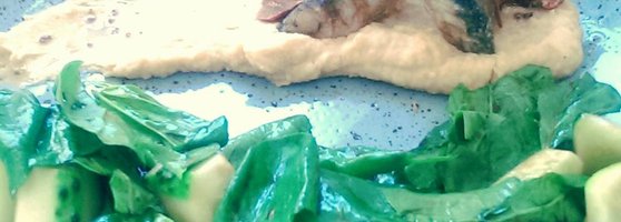 Салат: маринованная свекла, шпинат, огурцы, пюре из бобовых, жаренная салака, корбан. Новое осеннее меню