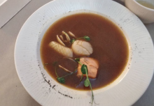 Борщ рівня столової. Не погано але точно не відповідає заявленому рівню закладу та і ціни. А канапки на сухарях. . буквально. Замість свіжого житнього багету, подали сухарь який ще і на гриль закинули. Якщо така якість на простих речах, дальше пробувати навіть не ризикуєм.