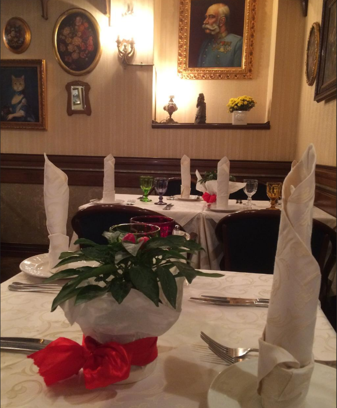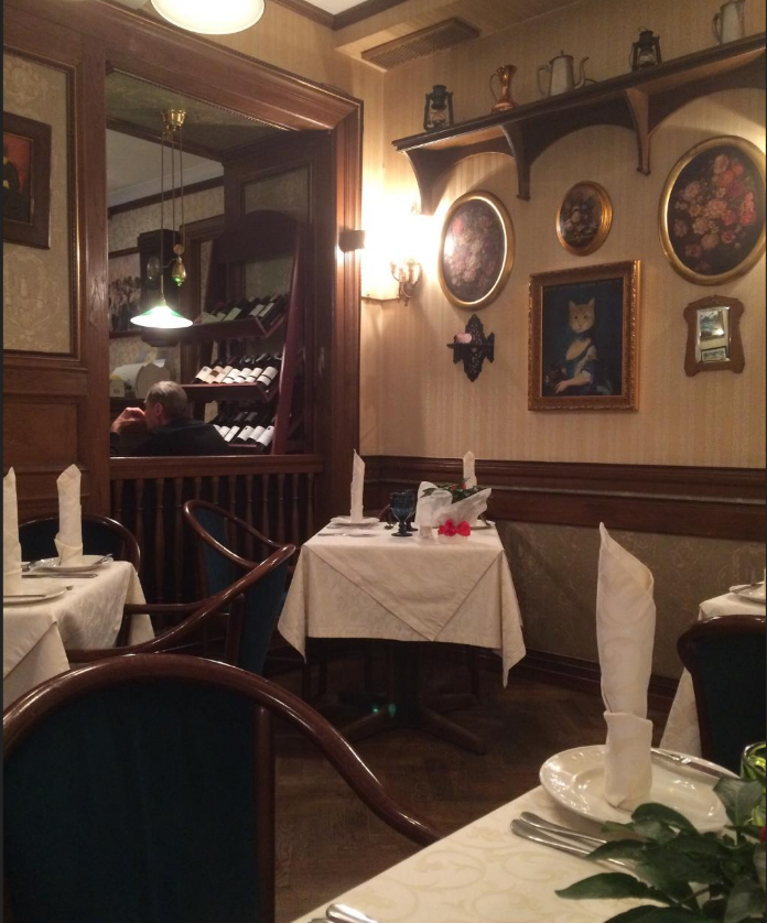 Небольшой уютный ресторан. Особенно приятно было находиться в канун Рождества! Золотые и красные шары на рождественской ели, свечи в старинных подсвечниках, деревянные панели, новогодние гирлянды и белые скатерти создавали необыкновенную праздничную атмосферу! Оригинальный комплимент от шефа! Блюда вкусные! Уходить не хочется! Отзывчивый, вежливый персонал!