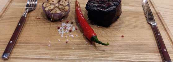 Так и появилась привычка раз в неделю заскакивать на миньон или стейк. Последний раз не понравилось абсолютно все. Официанта - нужно быть охотником чтобы поймать взгляд на себе и вовремя поднять руку, соль и перец - вообще отдельная история, их приносят только если попросишь, стейки - стали больше похожи на отбивные, причём не важно какой прожарки ты заказал.
