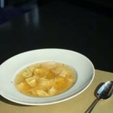 1) Суп с олениной. Неплохой бульон, маленькие кусочки оленины присутствуют, но суп испорчен массой пассерованных овощей и огромным количеством растительного масла. Вкус этой "зажарки" в супе пестрит. Было бы идеально выбросить оттуда все овощи и масло, оставить только бульон, оленину и совсем немного свежих (слегка проваренных) овощей не мелко порезанных чтобы они не оставляли доминирующий вкус в супе и была альтернатива не употреблять их вообще.