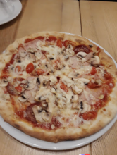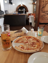 Їли тільки піцу, вона на тонкому тесті, звичайна. Двом дорослим буде однією замало. Ми вдвох з трирічною донькою одну з'їли без проблем. В цілому непогане заклад прямо на площі Ринок, але для Львова дуже звичайне, таке може бути в будь-якому місті. А у Львові завжди хочеться феєрверку вражень, свята)))) Втім, для любителів піци непогано. Свою нішу займає і це ОК.