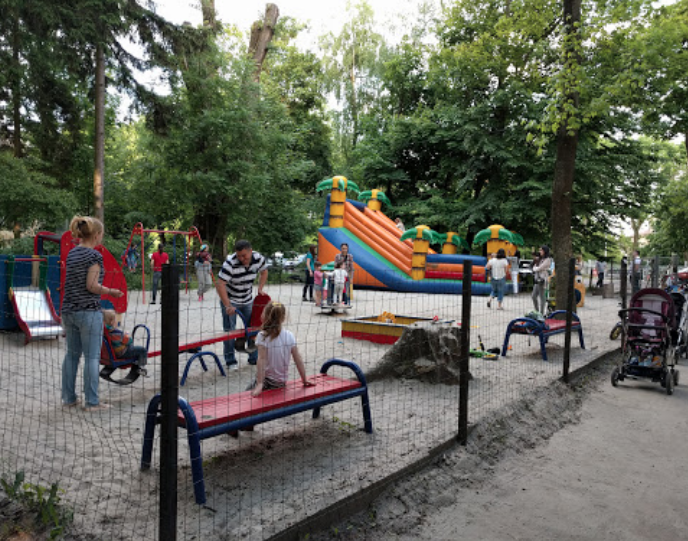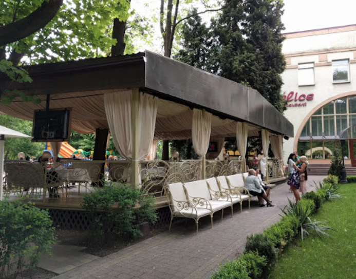 Знаходиться в парку,спокійно,свіже повітря.Дуже гарний дизайн тераси.Ціни дуже високі,але якості не відповідають)Замовляла борщ,порція дуже велика і подають з салом.Сало смачне,а борщ ніякий(Несмачно.Грецький салат був залитий соняшниковою олією,хоча мала б бути оливкова.Рекомендую прийти і попити чай на терасі
