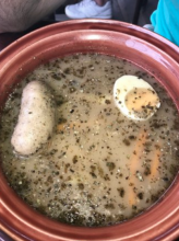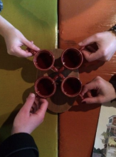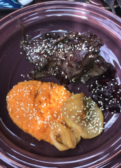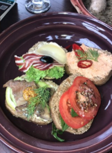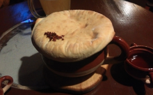 Понравилась оригинальная подача блюд в горшочках с крышечками из теста. Салат из овощей, несмотря на просто название состав практически полностью из капусты оказался неожиданно вкусным, что отметили все, кто его пробовал. Крылышки и тарелка закусок тоже понравились.