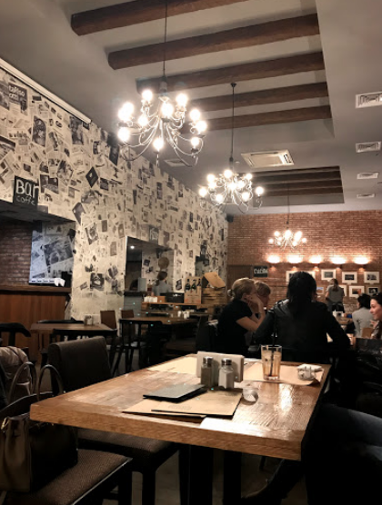Большой зал, удобные диваны, интерьер простой, но приятный. Пицца 4 сыра отличная, чайс имбирем и лимоном почти без имбиря)) так что, если кто любит острый имбирный чай — просите тройную порцию имбиря. Вайфай есть, что уже хорошо :)