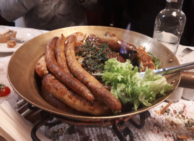 Еда очень вкусная, есть угол для детей с аниматорами и наверху большой зал для фуршетов, внутри бассейн с форелью которую можно выловить и ее при тебе приготовят. При входе магазин с туристическими штуками всякими.