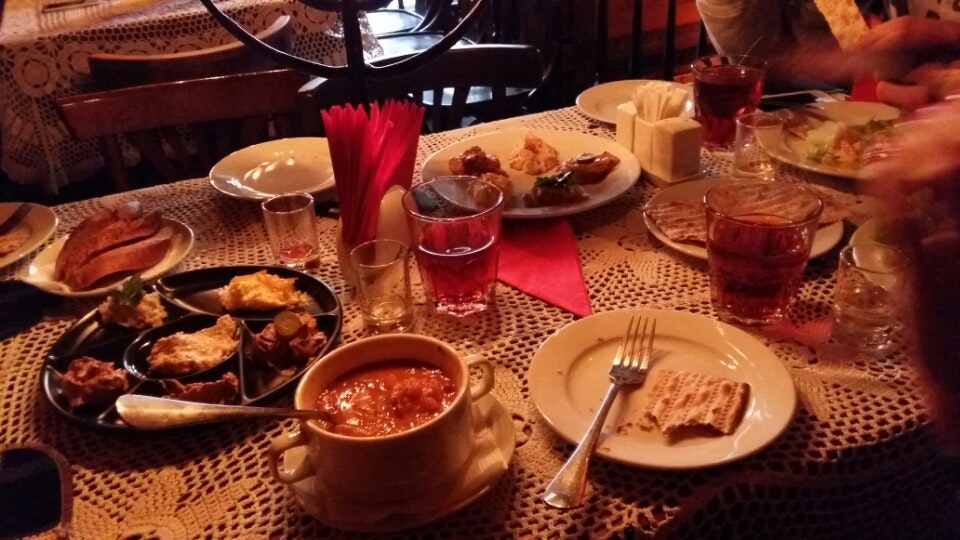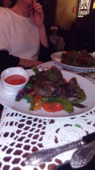 Заведение колоритное-еврейская музыка.Перед едой официант всем моет руки над медным тазиком.Сразу предупреждает ,что в меню нету цен-надо торговаться(прикольно и доставляет удовольствие). Заказывали телячью вырезку и овощной салат- неплохо.Персонал вежливый и отзывчивый. Торговались дооолго. Получили карту клиента, наливку "на ход ноги" и массу хорошего настроения.