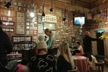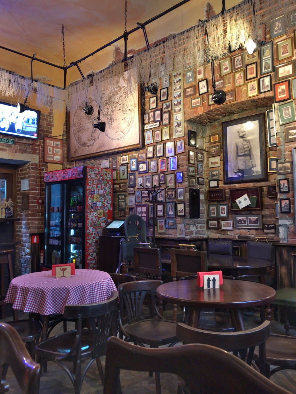 Заведение интересное. Необычный интерьер, но к сожалению чересчур наляпистый для столь маленького помещения. Хотелось бы ближе посмотреть на открытки, но сделать это нет возвожности, так как все заставлено плотно столиками. Кухня не плохая, вкусная паста и десерты, свежее пиво, а вот фирменные чипсы совсем не очень. К пиву подают солод, очень интересная закуска, напоминающая семечки.