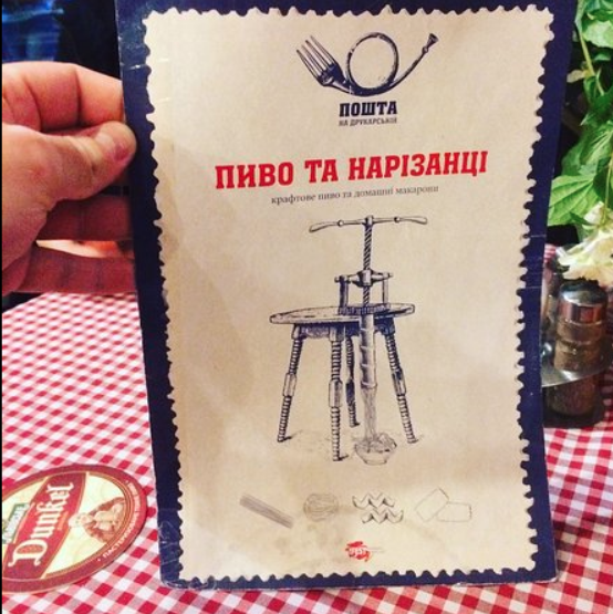 В меню разные виды "наризанцив" (они же паста), крафтовое пиво, и есть "домашнее" - настойки/наливки. Имеется дегустационный сет - "Бандероль від поштаря", 5 видов домашнего по 50гр, цена 111 грн. (поштучно - 24грн/50грн). Из вкусов представлены смородина, шоколад, лимончелло, груша, и вишня.