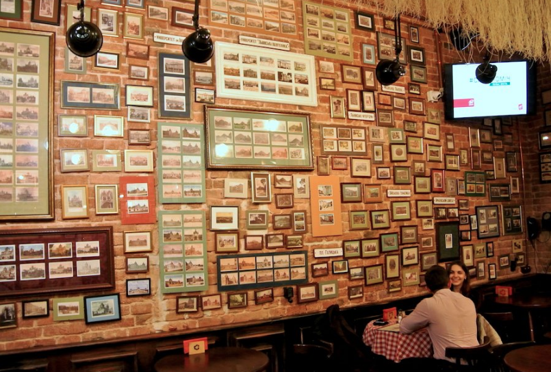 Можно долго сидеть задрав голову и изучать стены усыпаные различными интересными старыми открытками и фотографиями. Меню хорошее