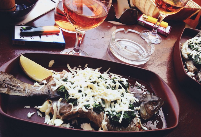 Очень понравилась форель со шпинатом и моцарелой, форель под сметаной с грибами, вино белое и розовое, салат с инжиром и вялеными помидорами, канапки с семгой, прошуто и баклажаном. Хочу ещё! (Итого Счет 509грн., на 2 персоны)