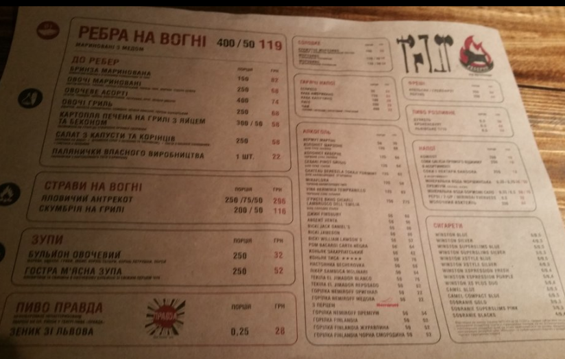 Классно продуманное место. Все круто от формы официантов, того как они рисуют на столе тарелку и вилки и говорят, что приборов не будет до момента, когда топориком разрубают твои ребрышки! Наш официант немного напутал с заказом, но настроения это не испортило) Народу очень много, явно популярное место среди своих. Ребрышки бомба и стоят удивительно недорого (около 100 гривен за очень приличную порцию с соусом, на одного человека более чем!!!). На входе в ресторан стоит огромная "жарильня" (не знаю как назвать ) с ребрами! Выглядит впечатляюще! Выдают смешные бумажные фартуки для грязнуль)