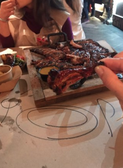 Очень забавное место- в ресторане нет приборов, их вам рисуют на бумаге. В меню вообщем-то всего одно блюдо -рёбрышки в медовом соусе и различные гарниры для них. Ребрышки оооочень вкусные!