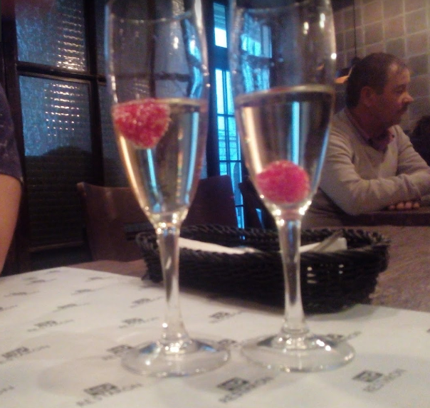 Дуже крута ідея подавати шампанське з малинкою) до шампанського подають ходдоги в стилі студромантика (вони порізані на 3 частинки)