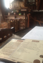 Понравилась необычная атмосфера уютного сельского дома Как будто в гости к соседу зашёл. Все натуральное: и деревянные двери и лестница - естественные, и сноп сена под телегой. Интересный интерьер с разноуровневыми залами, отделенными под отдельные компании.